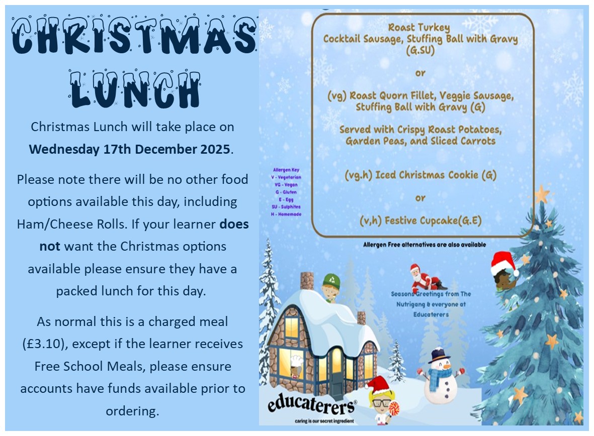 Please note there will be no other food options available this day, including Ham/Cheese Rolls. If your learner does not want the Christmas options available please ensure they have a packed lunch for this day.