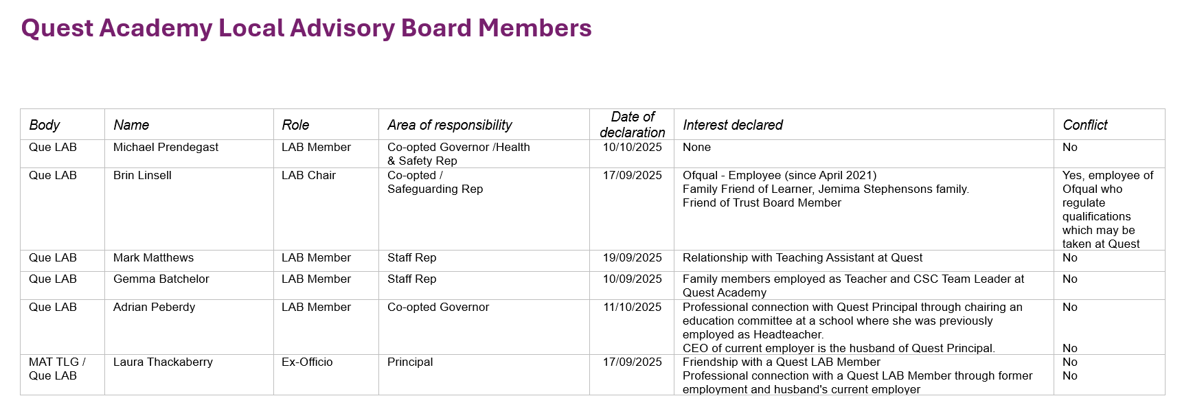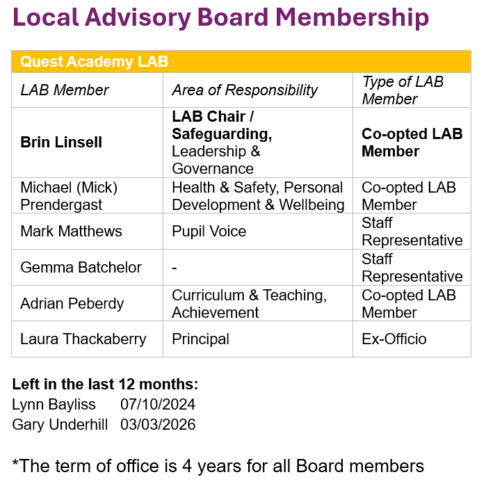 Quest's Local Advisory Board (LAB) plays a key role in supporting MacIntyre Academies Trust Board to fulfil their regulatory duties by providing local scrutiny.